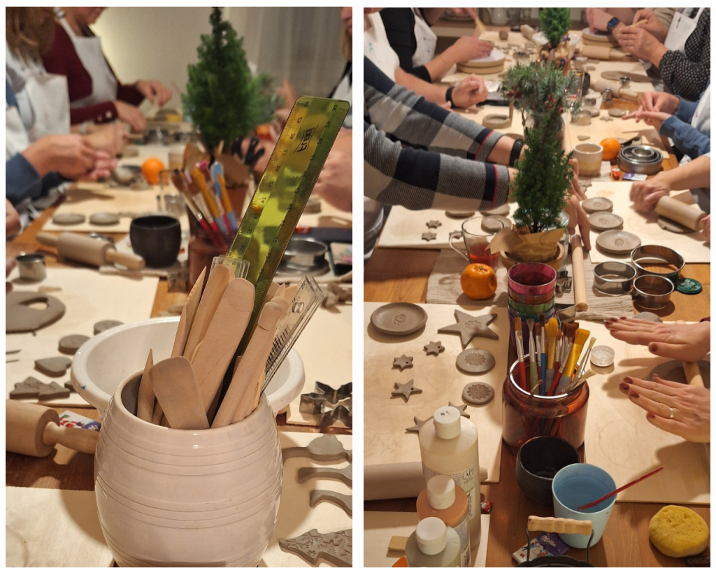 Doch das war noch lange nicht alles! Als krönender Abschluss unserer Weihnachtsfeier ging es zur lieben Anja von „Liebevolle Auszeiten“. Dort durften wir unsere kreative Seite entdecken und gemeinsam töpfern. Vom ersten Formen des Tons bis hin zu den fertigen Werken war es nicht nur ein entspannendes Erlebnis, sondern vor allem ein wunderbarer Moment, um den Alltag zu vergessen und gemeinsam etwas von Hand zu erschaffen. Ob kleine Schälchen, Weihnachtsdeko oder individuelle Geschenke. Wir haben kleine Kunstwerke erschaffen, welche uns noch lange an diesen schönen Tag erinnern werden. Ein herzliches Dankeschön an Anja für ihre geduldige und herzliche Begleitung!